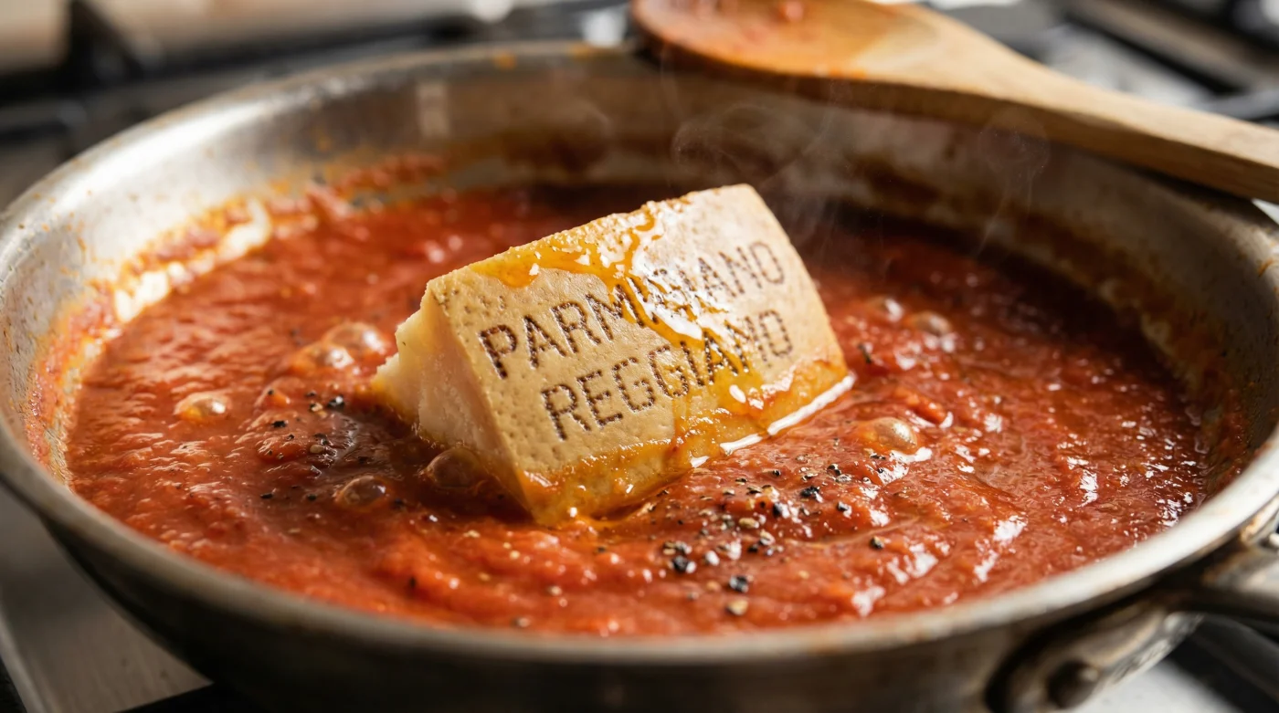 Es ist ein typischer Dienstagabend. Der Regen schlägt leise gegen das Küchenfenster, während auf dem Herd eine hastig angesetzte Tomatensauce blubbert. Du rührst mit dem Holzlöffel durch den Topf und siehst, wie sich am Rand eine wässrige Pfütze bildet. Die rote Flüssigkeit trennt sich von den Tomatenstücken. Du probierst – es schmeckt nach Tomate, ja, aber flach. Die Seele fehlt. Dein Blick fällt auf das Schneidebrett neben dem Herd. Da liegt sie: die steinharte Kante des Parmesans. Das Stück, das sich einfach nicht mehr reiben lässt und nun nutzlos erscheint. Deine Hand wandert bereits in Richtung Mülleimer. Halt ein. Genau in diesem harten, abweisenden Stück Käse liegt die Rettung für dein Abendessen.