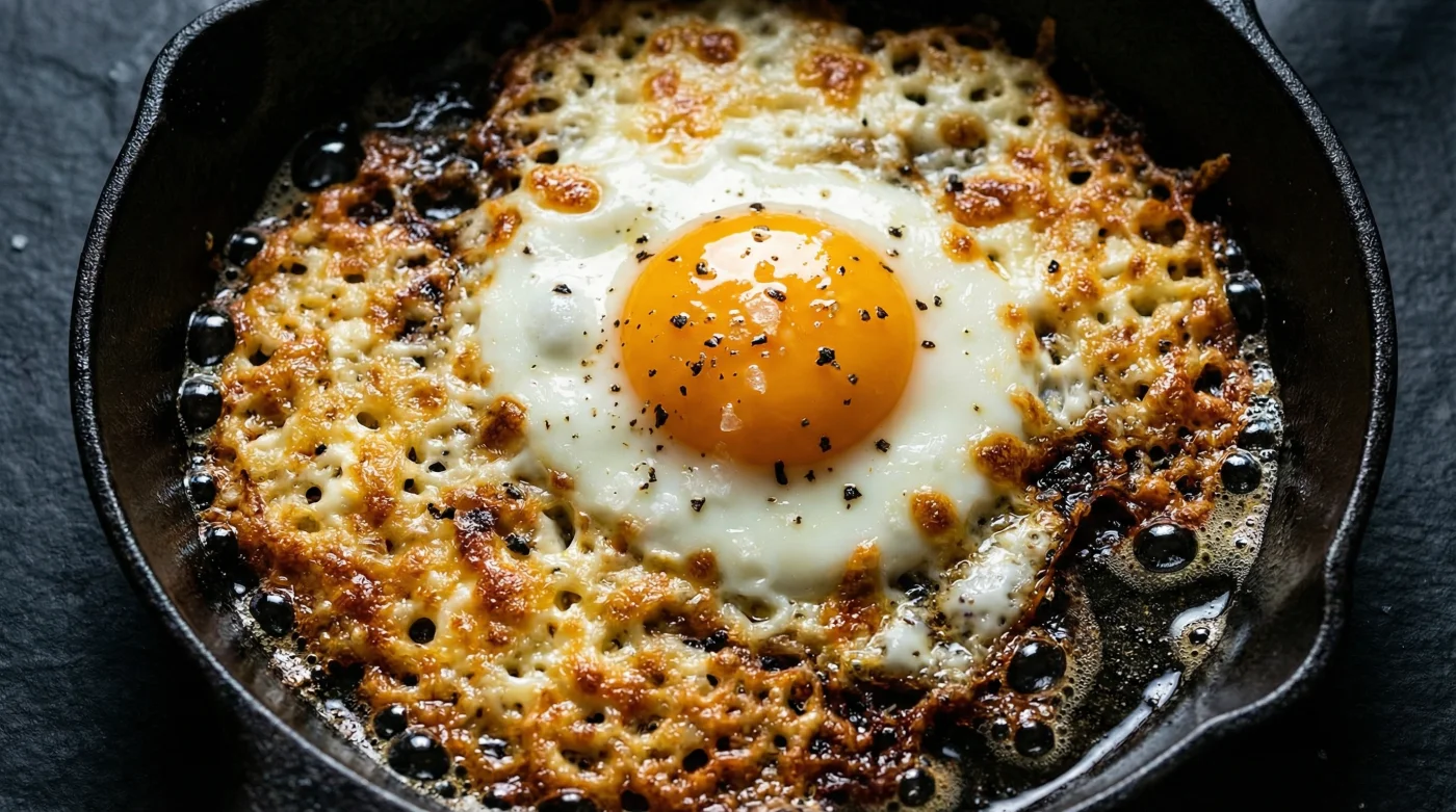 Der Kontrast könnte nicht schärfer sein: Wo ein normales Spiegelei sanft stockt, entsteht hier ein kleiner, hitziger Konflikt. Das Eiweiß verbindet sich mit dem schmelzenden Käse, bevor dieser am Pfannenboden zu einer krossen, goldenen Rüstung erstarrt. Es ist kein gewöhnliches Frühstück mehr. Es ist ein lautes, salziges Erwachen, das in fünf Minuten auf dem Teller liegt.
