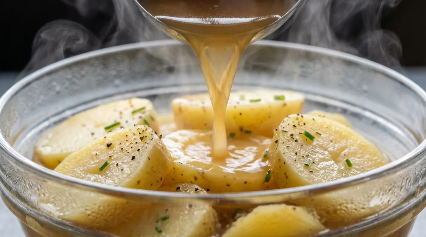 Der Schlüssel liegt in einem einfachen Austausch: Heiße Flüssigkeit für heiße Stärke. Warme Brühe zieht tief ein und füllt die noch offenen Poren der Kartoffel bis in den innersten Kern. Anstatt die Zutaten nur oberflächlich zu vermengen, marinieren Sie die Knolle von innen heraus. Der Salat schmeckt am Ende nicht nach Dressing mit Kartoffeln, sondern als wäre die Kartoffel selbst aus purem Geschmack gewachsen.