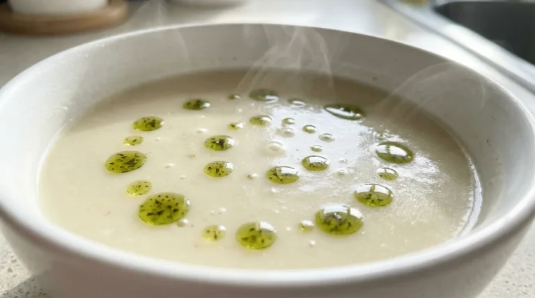 Nachrichten Grünes Kräuteröl in weißen Cremesuppen erzeugt blitzschnell eine teure Sternekoch-Optik. By Stefan Schmidt / April 14, 2026 Cremesuppen werden zuhause meist nur mit faden Croutons dekoriert. Lerne die simple Küchentechnik, wie du mit kontrastierenden Öltropfen blitzschnell ein…